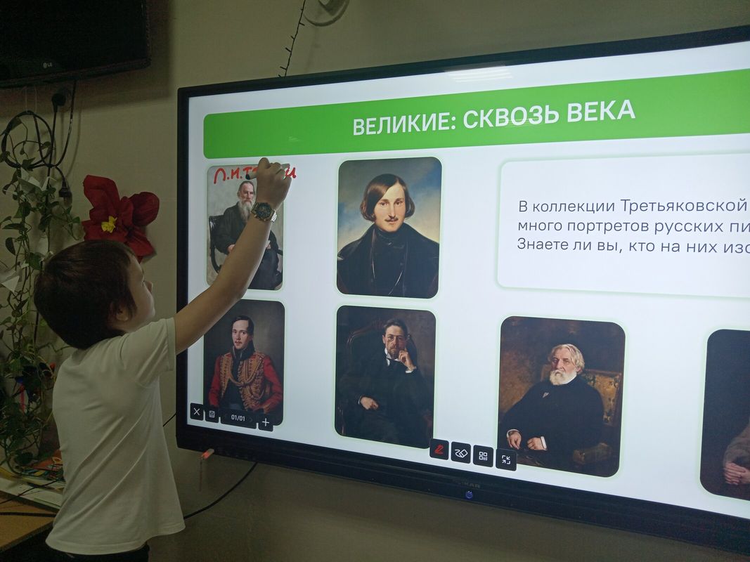 В ходе урока обучающиеся обсудили, что такое творчество и каким оно бывает; узнали о знаменитых русских писателях, композиторах и художниках; поговорили о том, как природа России вдохновляет на творчество; посмотрели интервью с продюсером Первого канала о международном конкурсе «Интервидение» и выполнили интерактивное задание. Дети с удовольствием сопоставляли музыку Чайковского и картины русских художников.